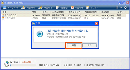 해당 작업의 백업을 시작한다는 알림창이 뜨며, [확인] 버튼을 클릭하면 백업이 시작됩니다.