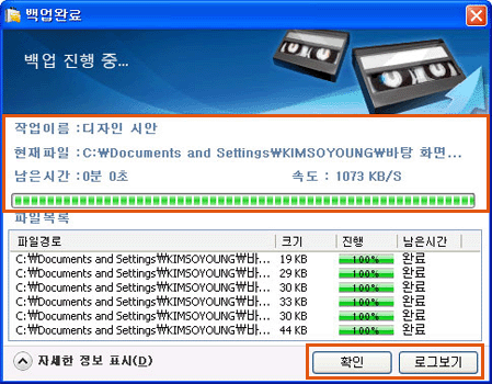 백업이 완료되면, 하단 버튼이 [확인], [로그보기] 버튼으로 변경됩니다.