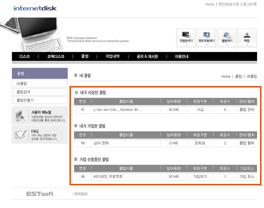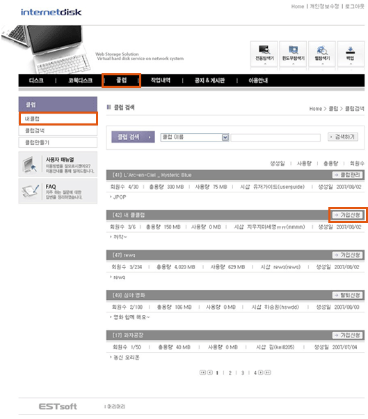 "내 디스크" 메뉴의 "클럽 이용 정보"에서 해당 클럽의 이름을 클릭하여 클럽에 접속하거나,