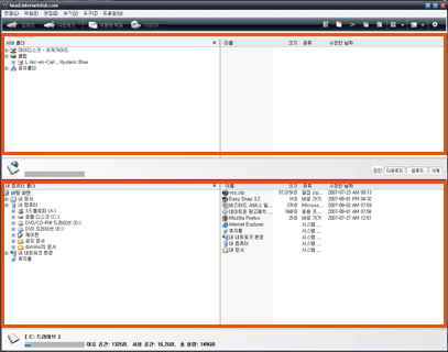 | 2. 인터넷디스크 전용탐색기가 실행됩니다. 화면 상단은 인터넷디스크 서버 폴더, 화면 하단은 사용 중인 로컬 컴퓨터 폴더입니다. |