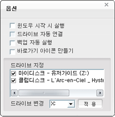 | 3. 접속 클라이언트 옵션에서 드라이브를 추가하거나 드라이브를 변경하여 적용시키면 윈도우탐색기 실행 시 변경 내용이 적용됩니다. |