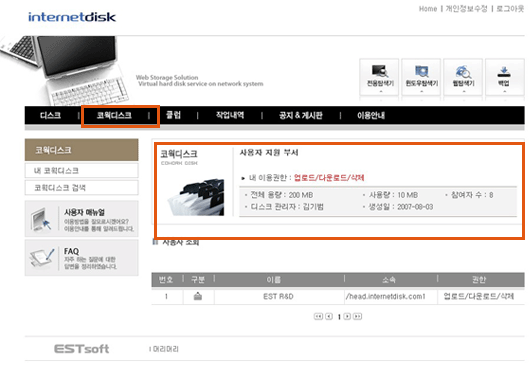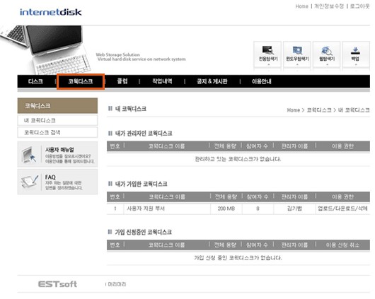 인터넷디스크 웹사이트 상단의 “코웍디스크” 메뉴를 통하여 코웍디스크 정보를 한눈에 볼 수 있습니다.