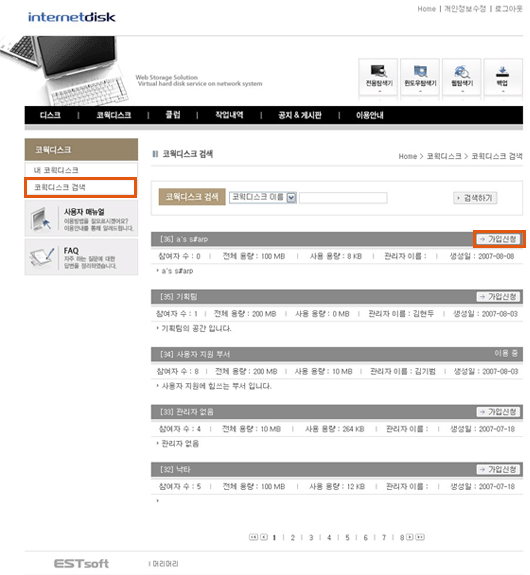 전체의 목록을 보고 [가입신청] 버튼을 클릭하여 가입 신청을 할 수 있습니다.