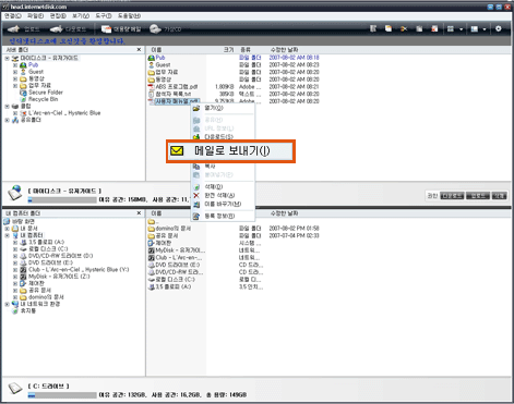 | 1. 메일로 보낼 파일을 선택한 후 (첨부 파일의 용량 제한 없음) 마우스 오른쪽 버튼을 클릭하고 “메일로 보내기”를 클릭합니다. |
