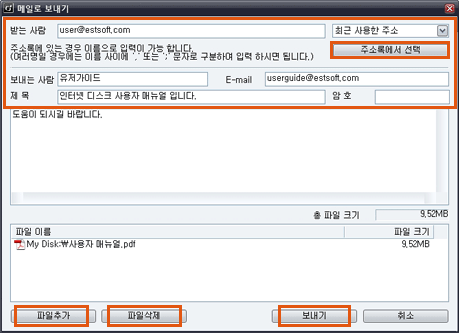 | 4. 파일 목록 중 전송할 파일을 확인하고 파일 추가 및 삭제가 가능하며 [보내기] 버튼을 클릭하면 메일이 전송됩니다. |