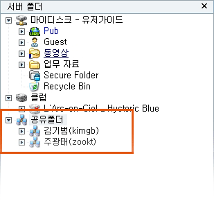공유 제공자에 추가된 사용자의 공유폴더는 서버 폴더 목록의 "공유폴더"의 하위에서 확인 할 수